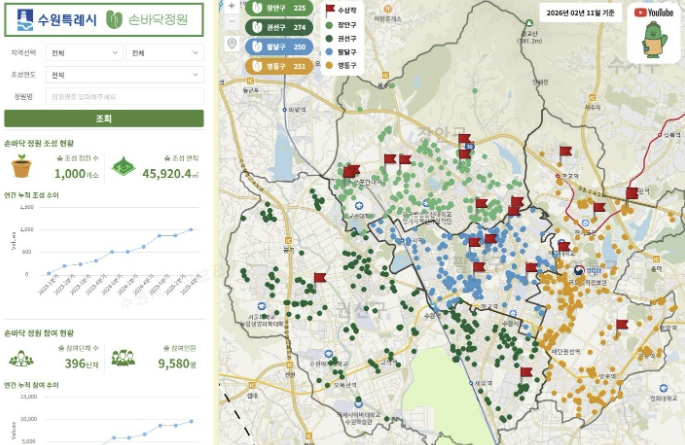 2024년에는 곳곳에 조성한 새빛수원 손바닥정원의 정보를 한눈에 볼 수 있는 온라인 지도 ‘지도로 보는 손바닥정원’을 구축했다. 손바닥정원 위치가 수원시 지도 위에 점으로 표시돼 있다.