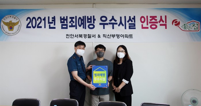 천안서북서에 따르면 ‘범죄예방 우수시설’은 경찰서 범죄예방진단팀이 해당 아파트에 대해 범죄예방 시설물을 진단하고 분석해 범죄로부터 안전이 확보됐다고 인정되는 시설에 대해 인증하는 제도다.