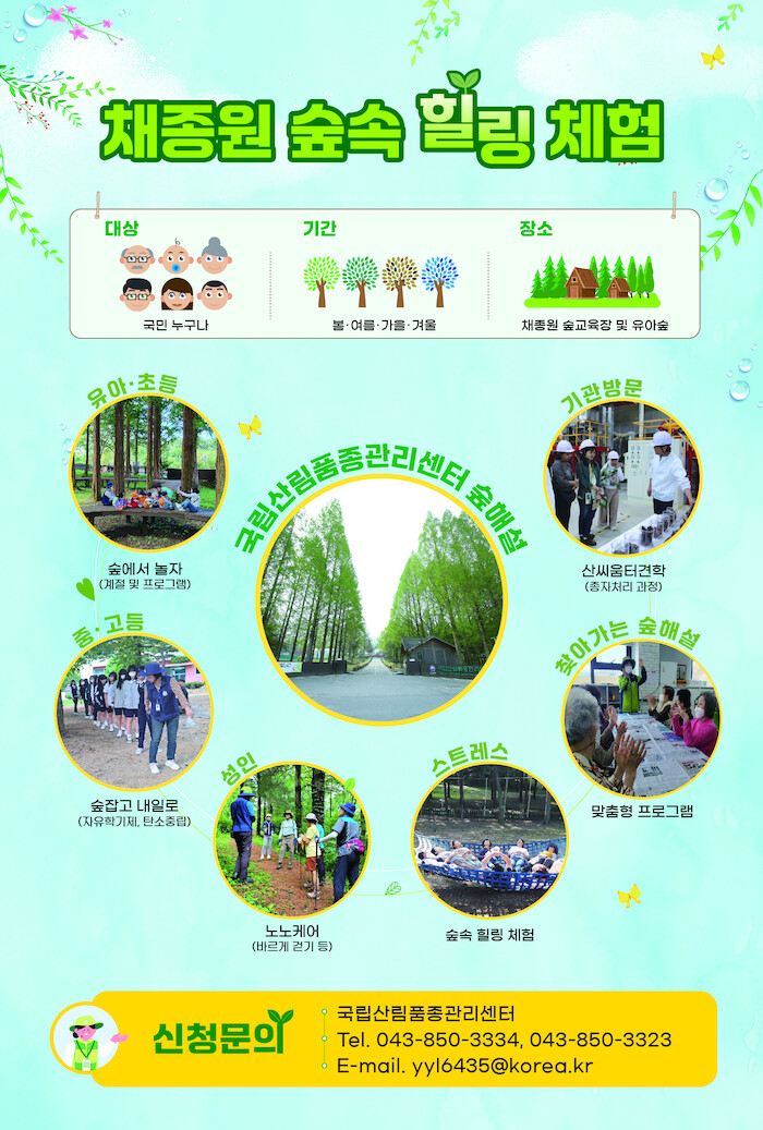 국립산림품종관리센터 내 채종원(산림종자 과수원) 숲교육장과 유아숲 2곳에서 운영되며, 유아들을 위한 채종원 숲속 놀이터, 청소년 자유학기제 교과과정 숲잡고 내일로, 노년층 및 소외계층 전용 숲 나들이, 소방·경찰 등 직장인 외상 후 스트레스 완화 맞춤형 체험 프로그램으로 운영된다