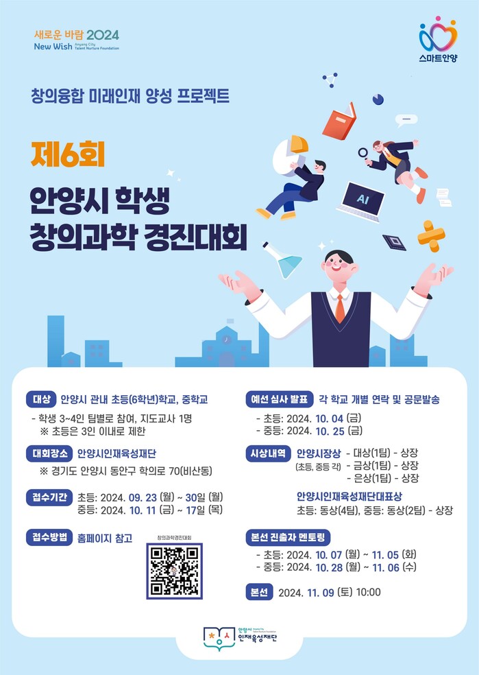 [세계로컬타임즈 = 이배연 기자] 안양시 인재육성재단은 오는 11월 9일 “제6회 안양시 학생 창의과학 경진대회”를 개최한다고 25일 밝혔다.