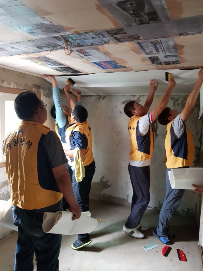 12일 충주시에 따르면 봉사회원 15명은 이날 충주시 대소원면 대소2리의 주성용(70)씨 집을 찾아 도배와 장판 교체 봉사활동을 전개했다.