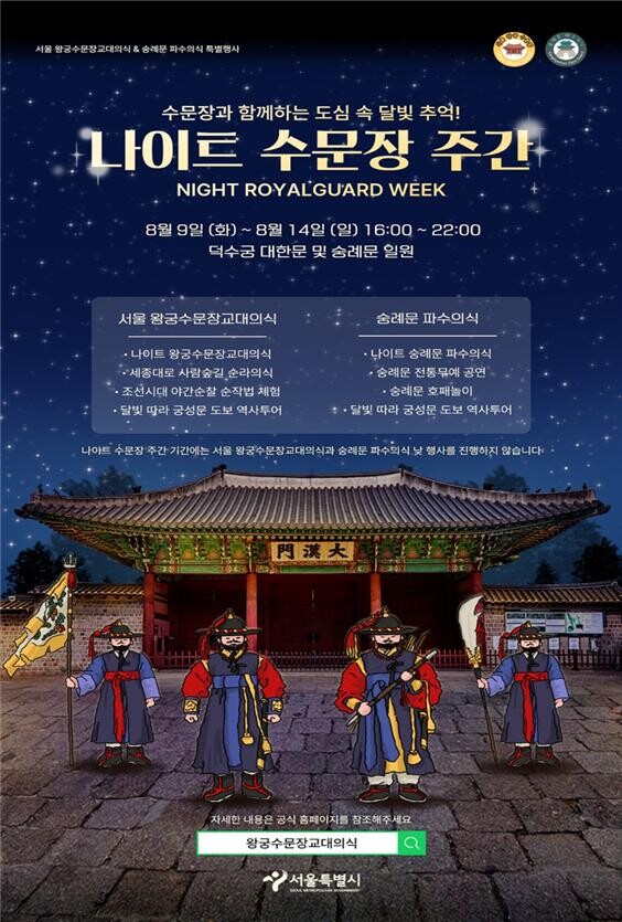 ‘왕궁수문장 나이트 수문장’ 행사는 매일 저녁 5시에 덕수궁에서 출발해 광화문광장까지 ‘광화문 순라’ 의식을 시연한다. 매일 저녁 7시부터 9시까지는 덕수궁 앞에서 수문장 야간 교대의식을 시연한다. 이외에도 조선시대의 야간 순찰법인 ‘순작법’체험 행사를 12일~14일 기간 동안 오후 6시와 7시에 진행한다.