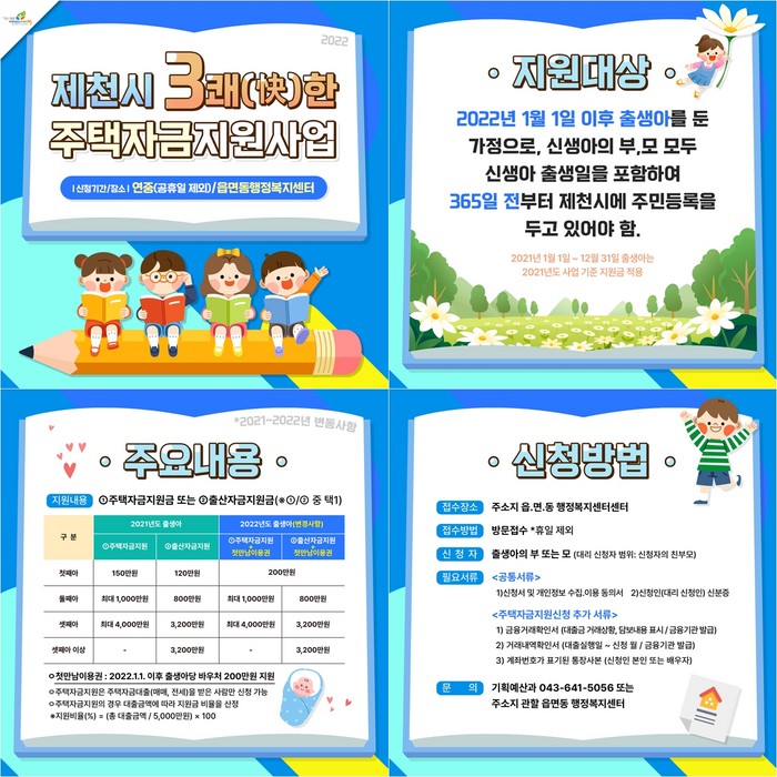 이상천 제천시장은 “우리시 대표 인구증가 시책인 3쾌한 주택자금 지원 사업이 자리 잡고 있는 가운데 출산가정의 경제 부담을 줄이는데 이바지 하고 있다”며, “아이 키우기 좋은 도시 조성을 위한 해당 정책의 지속적인 보완 및 강화를 통해 지자체 인구정책의 대표적인 모범 사례로 자리 잡을 수 있도록 노력하겠다.”라고 했다.