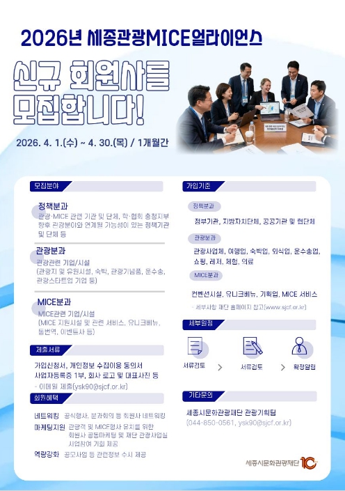 특히 재단의 ‘2026 세종 MICE 유치·개최지원사업’을 신청하는 단체가 얼라이언스 회원사나 세종의 유니크베뉴를 활용할 경우, 지원금 최대 30%의 가산 혜택을 부여받게 되어 실질적인 비즈니스 연계 효과를 거둘 수 있다.