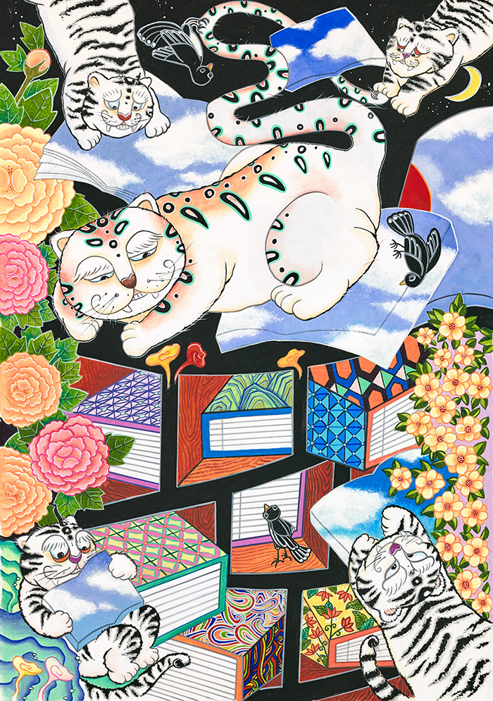 | ▲ 호랑이 책가도(61×43cm) 순지에 분채 동양화물감.ⓒ유은정 작가 |