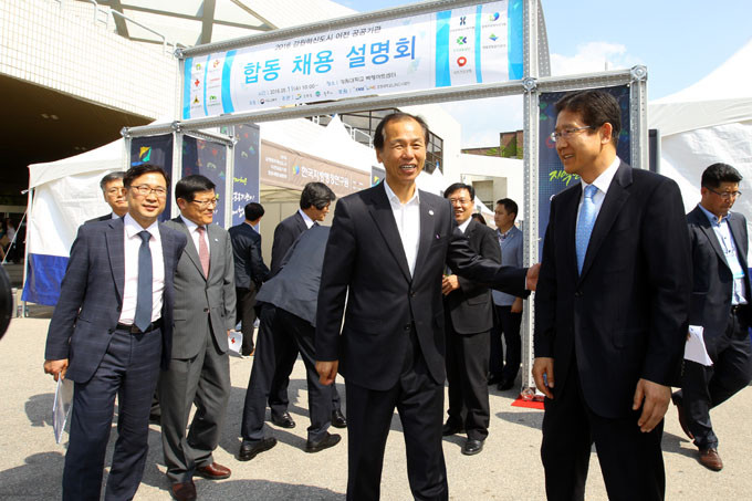 | ▲ 최문순 강원도지사(오른쪽 두 번째)가 지난 5월 11일 강원도 11개 이전공공기관, 합동채용설명회 에 참석해 관계자들과 인사하고 있다. 강원도청 제공 |