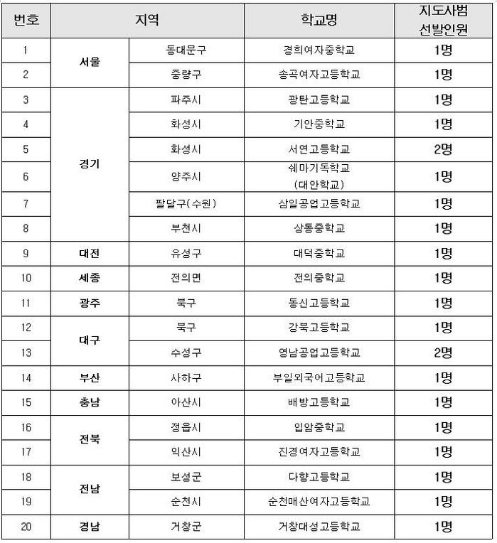 올해 지원을 받을 곳은 서울, 부산을 비롯한 전국 18개 학교와 지난해 참여 학교 중 평가에서 우수학교로 선정된 부천시 상동중학교와 세종시 전의중학교는 자동으로 선정돼 올해도 지원을 받을 예정이다.
