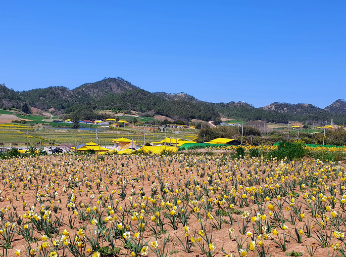 예전 같으면 마늘과 양파 등이 자라야 할 들판에 노랗고 하얀 꽃의 수선화가 자태를 뽐내고 있다.