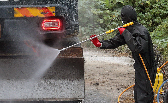 | ▲국내 10번째 아프리카돼지열병이 발병한 2일 오전 경기 파주 파평면의 ASF 확진 판정을 받은 돼지 사육 농가 인근에서 살처분 작업을 위해 들어서는 포크레인에 파주시청 직원이 방역 작업을 하고 있다. (사진=뉴시스) |