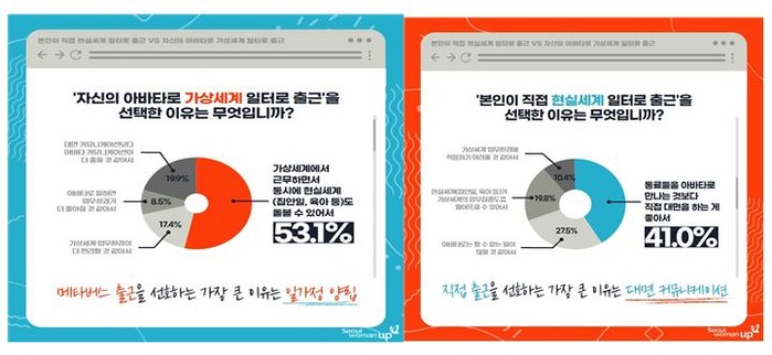 서울시 여성능력개발원에서는 미래사회에 달라질 근로형태와 고부가가치 미래일자리에 대한 인식 파악을 위해 ‘본인이 직접 현실세계 일터로 출근vs자신의 아바타로 가상세계 일터로 출근’을 주제로 SNS를 통해 설문조사를 실시했다.