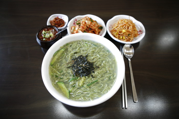 우리밀칼국수의 보리싹국수는 콜레스테롤을 낮추고 성인병 예방에 효과가 있는 보리싹과 밀을 사용해 면을 만들었다.
