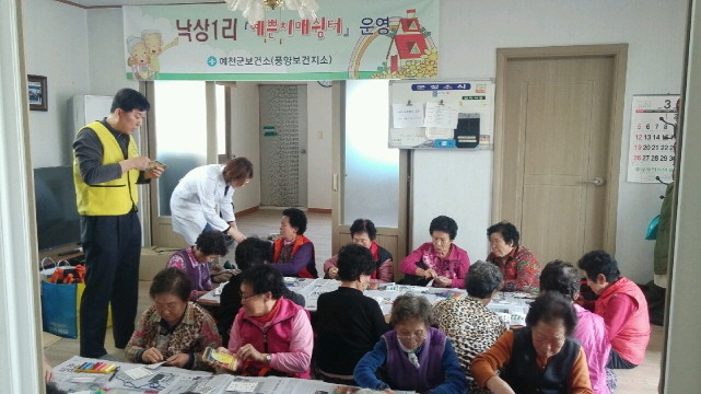| ▲ 예천군보건소 관계자들이 낙상1리에서 '예쁜치매쉼터'를 열고 인지재활 프로그램을 진행하고 있다.<사진제공=예천군청> |
