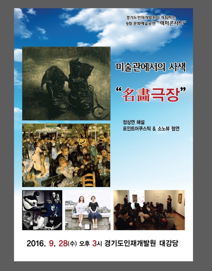 김원섭 경기도인재개발원장은 “9월 렉처콘서트는 명화를 통해 예술가의 시대적 고뇌와 역경을 이해하고, 새로운 희망과의 만남을 경험하는 자리”라며 “앞으로도 많은 사람이 즐길 수 있는 다양한 주제의 문화, 예술 공연을 마련하겠다”고 말했다.