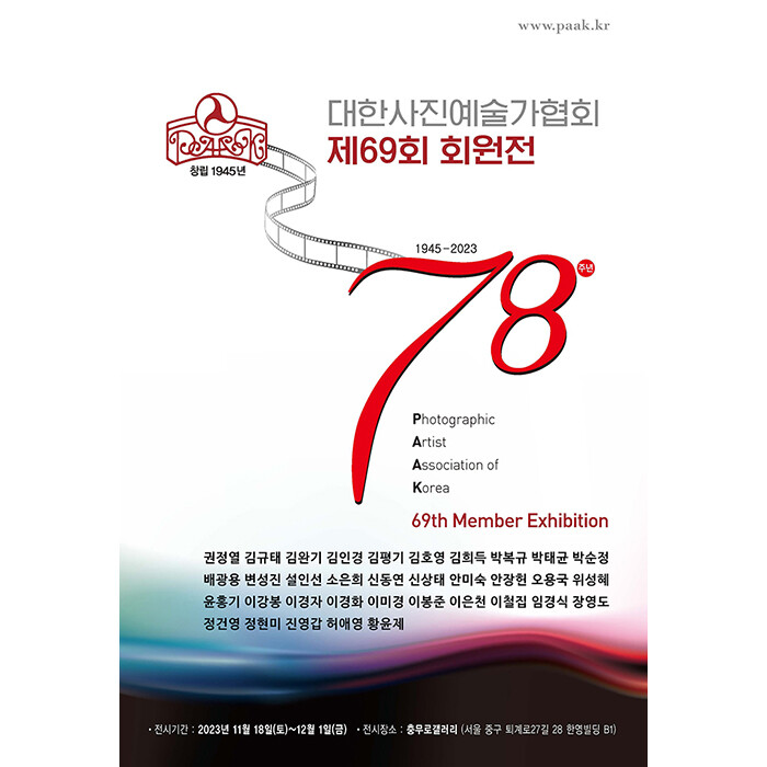 [세계로컬타임즈 김영식 기자] 대한사진예술가협회(이하 대한사협)가 올해 78주년을 맞이해 서울 본회 69회 회원전을 11월 18일~12월1일까지 ‘화합과 소통의 장’을 마련, 충무로 갤러리에서 사진전을 개최한다고 14일 밝혔다.