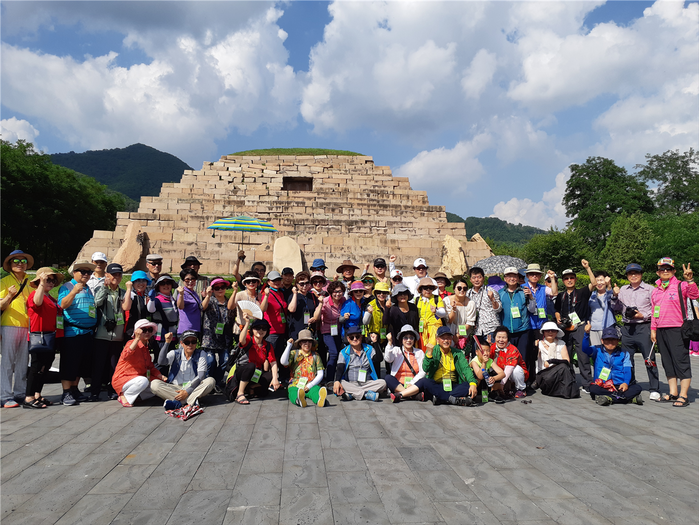 | ▲ 세계일보 조사위원 백두산 탐방단이 지난달 4일 장수왕릉 앞에서 기념촬영을 하고 있다. |