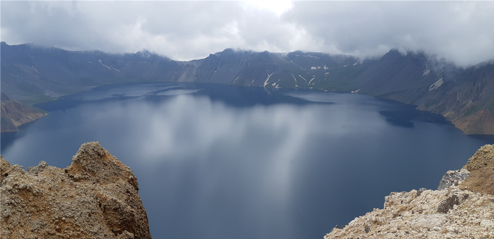 | ▲ 세계일보 조사위원 탐방단이 지난달 5일 북백두에 오른 후 바라본 천지 모습. |