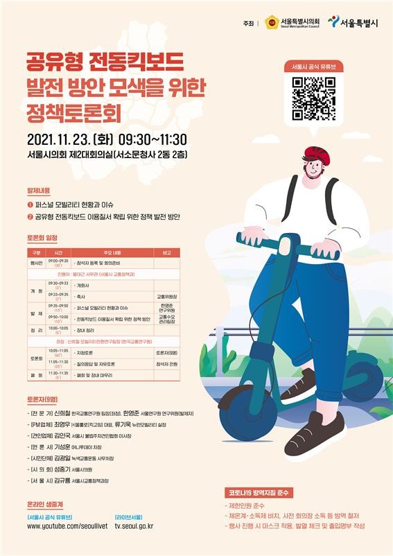 지정토론에는 서울시의원, 서울연구원, 공유 전동킥보드 업체, 서울시 불법주차견인협회, 시민단체 등이 참여한다.