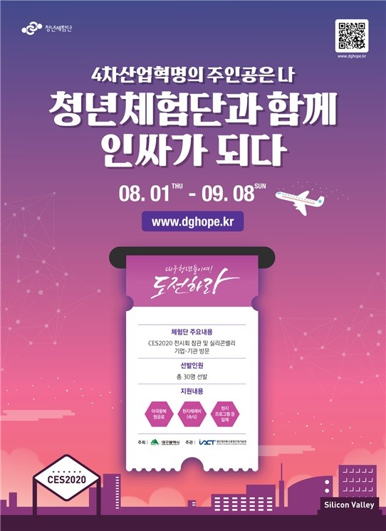 [세계로컬타임즈 최영주 기자] 대구시는 ‘4차 산업혁명 청년체험단’ 3기 참가자를 모집하고 국제전자제품박람회(CES2020) 참관 및 실리콘밸리 기업 및 기관 방문을 추진한다.