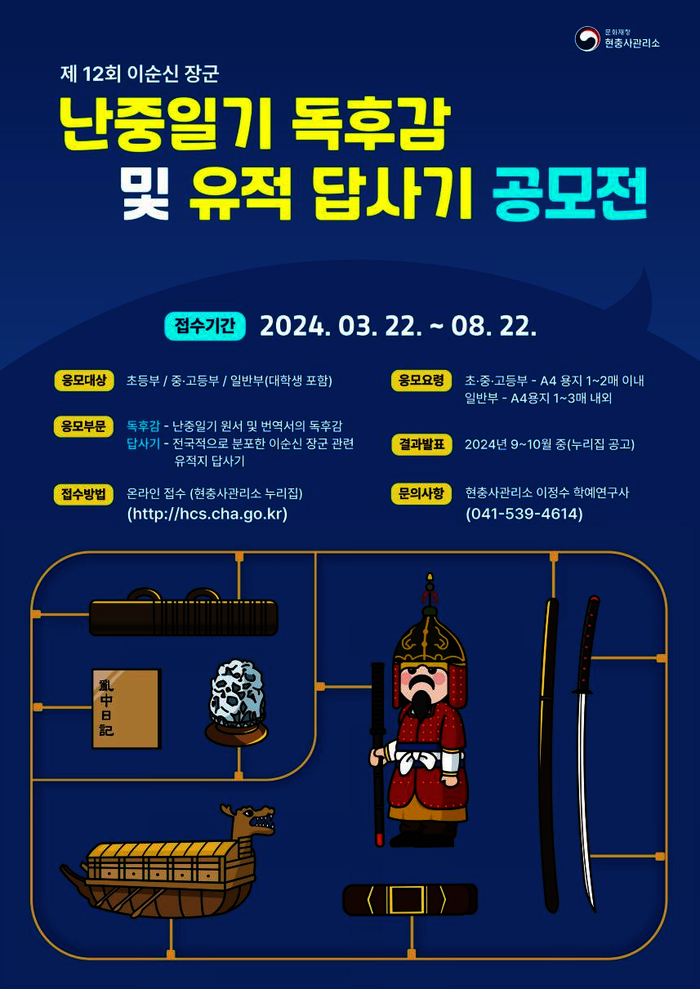 응모는 현충사관리소 누리집 내 게재된 알림창(배너)을 누를 시 접속되는 응모 화면을 통해 오는 22일부터 8월 22일까지 가능하다.