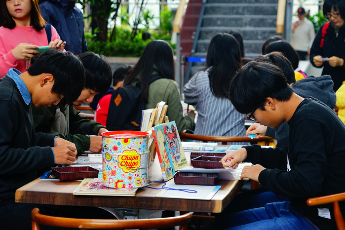 | ▲ 부천시가 마련한 도서관 문화한마당 행사에 참여한 학생들이 프로그램 수행을 위해 열중하고 있는 모습. <사진제공=부천시청> |