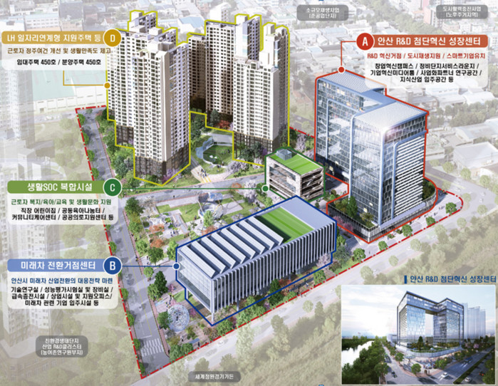 이를 위해 안산 R&D 첨단혁신 성장센터 미래차 전환거점센터 생활SOC 복합시설 LH 일자리연계형 지원주택(900호) 등을 추진해 인근 사동 정비단지 일원을 새로운 신산업단지로 탈바꿈시킬 것으로 기대된다.