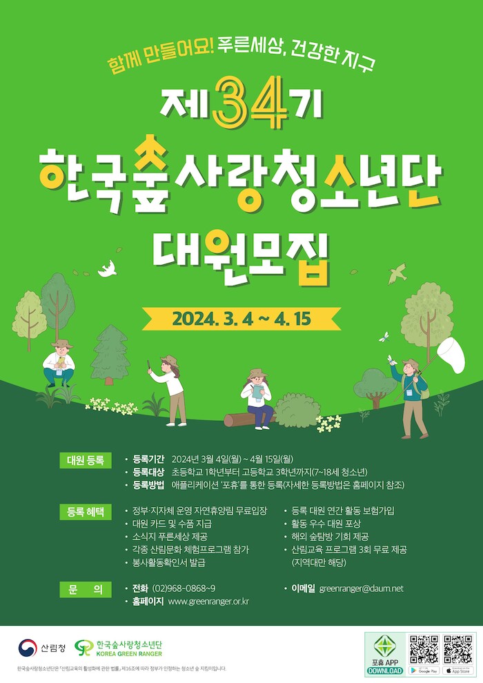 [세계로컬타임즈 이효진 기자] 산림청은 4월 15일까지 2024년 한국숲사랑청소년단 34기 대원을 모집한다.