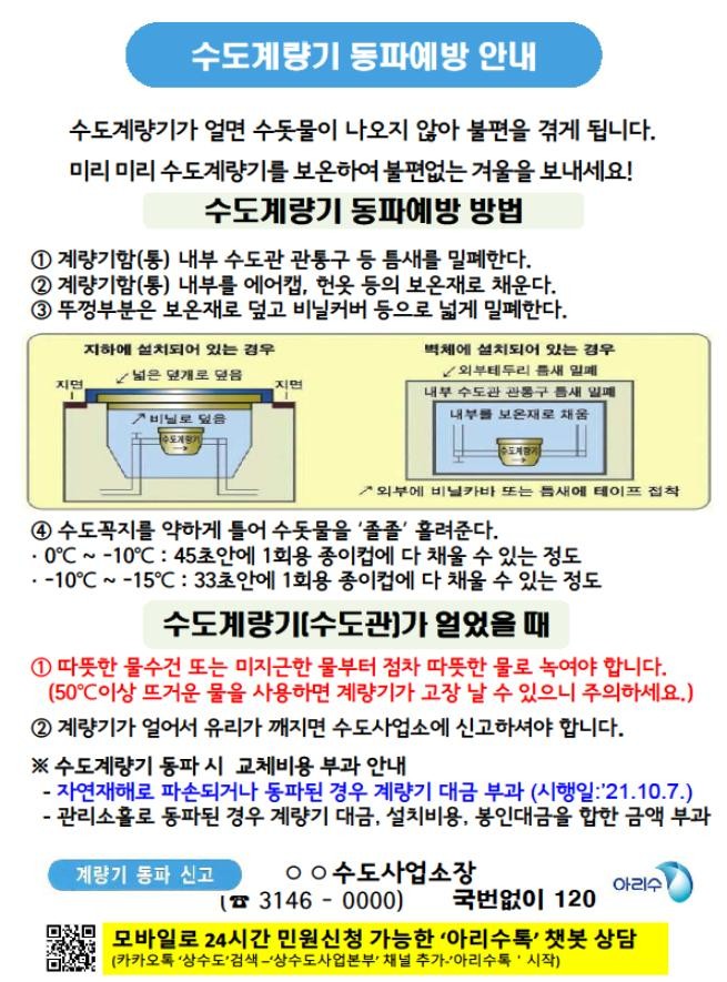 각 가정에서는 계량기함을 헌옷·수건 등 마른 보온재로 채우거나, 보온재가 젖었으면 반드시 헌옷 등 젖지 않은 새로운 보온재로 교체해줘야 한다.