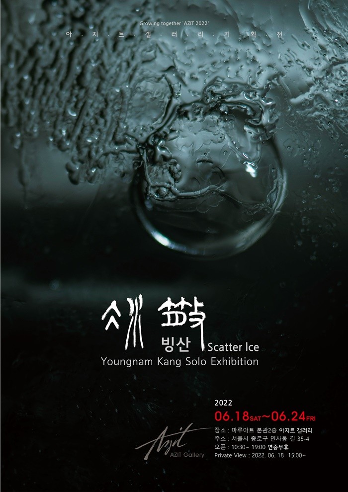 한편 강 작가는 지난해 Dreaming Stone(꿈꾸는 몽그라진 돌)은 얼음을 이용해 쌓을 수 없는 몽돌을 서로 쌓아 조형적 아름다움을 표현하고자 했다면, 이번 전시 Scatter ice(氷散·얼음을 흩트리다)는 얼음을 풀어 헤쳐나가며 나타나는 현상 속에 어렴풋이 떠오르는 어린 시절을 상기시키려 했다. 그 이야기에 꿈과 초현실적인 희망을 담아 회화적인 요소를 가미, ‘얼음 산수화’를 중점으로 표현했다.