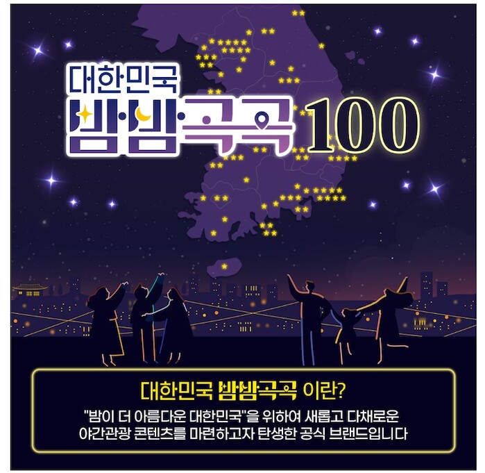 이번에 선정된 ‘대한민국 밤밤곡곡 100’은 지방자치단체에서 각 지역의 후보지를 추천받고 전문가 검토를 거쳐 확정했다. 자세한 정보는 ‘대한민국 구석구석’ 테마 페이지에서 확인할 수 있다.