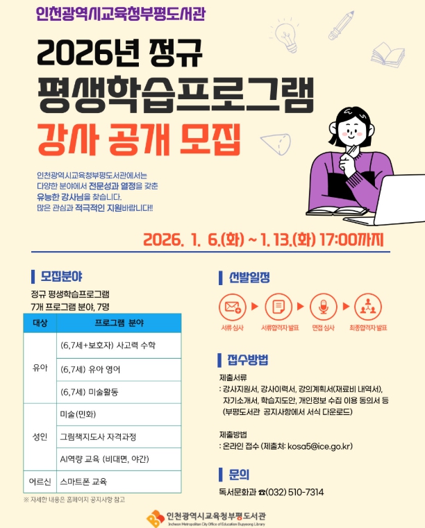 부평도서관 관계자는“전문성과 열정을 갖춘 강사들이 지역 주민들에게 다양한 학습 기회를 제공하고, 삶의 질 향상에 기여할 수 있기를 기대한다”며 “관련 분야 강사들의 많은 관심과 적극적인 지원을 부탁드린다”고 전했다.