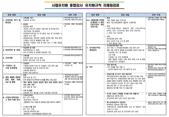 향후 종합감사 이전 단계에서 유치원이 자체적으로 규칙을 점검하고 보완할 수 있도록 ‘사립유치원 유치원규칙 자체점검표’를 배포해, 감사취약분야를 사전에 예방하고 자율적인 개선을 유도할 계획이다.