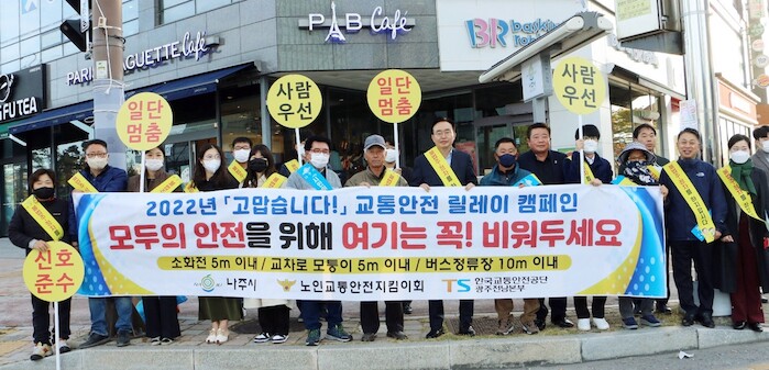 [세계로컬타임즈 강석운 기자] 나주시(시장 윤병태)는 빛가람동 한전KDN사거리 일원에서 ‘고맙습니다 민·관 합동 교통안전 릴레이 캠페인’을 전개했다고 28일 밝혔다.