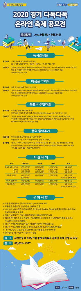 독서에 대한 관심과 참여를 위해 경기도는 ‘2020 경기 다독다독 온라인 축제’를 진행하고 오는 24일까지 ‘2020 경기 다독다독 온라인 축제 공모전’을 진행한다.
