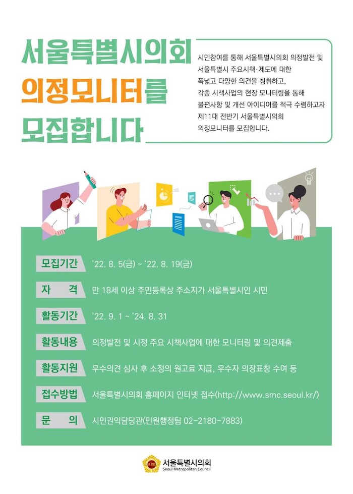 지원신청은 서울특별시의회 홈페이지 ‘시민참여→의정모니터→11대전반기의정모니터신규모집’ 게시판에 지원서를 작성 19일까지 제출하면 된다.