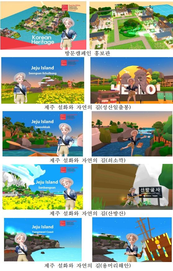 성산일출봉, 산방산, 쇠소깍, 용머리해안 등 4개의 장소로 구성된 ‘제주 설화와 자연의 길’은 각 지역의 독특한 실감 이미지와 더불어 제페토 내 맵에서 다양한 과제와 관련 행사를 구현해 이용자들이 한국 문화유산에 대한 흥미와 재미를 느끼도록 했다.