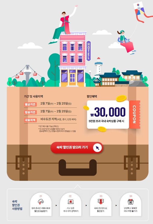5만 원 초과 숙박상품 예약 시 3만 원 할인권을 받을 수 있으며, 지역관광 활성화 취지에 따라 비수도권 지역(서울, 경기, 인천 제외) 숙박시설로 한정해 진행한다.