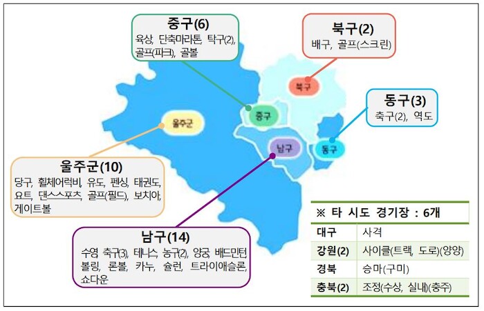 사격(대구), 사이클(강원도 양양), 승마(구미), 조정(충주)은 다른 시도에서 개최된다.
