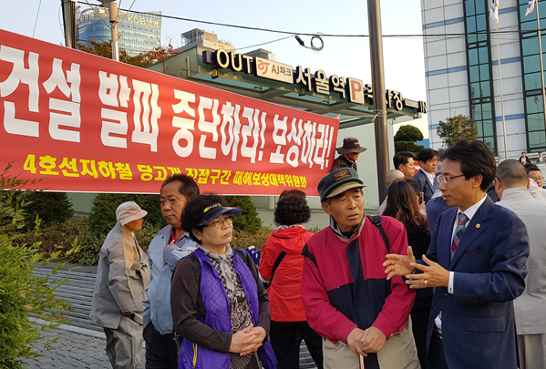 | ▲ 한국철도공사 수도권본부 앞에서 지난 10월 27일 지하철발파로 피해를 입고 있는 주민들이 항의 시위를 하고 있다. 사진은 김광수 서울시의원이 시위하는 주민들에게 피해 상황에 대해 이야기를 나누고 있는 모습. <사진제공=서울시의회> |