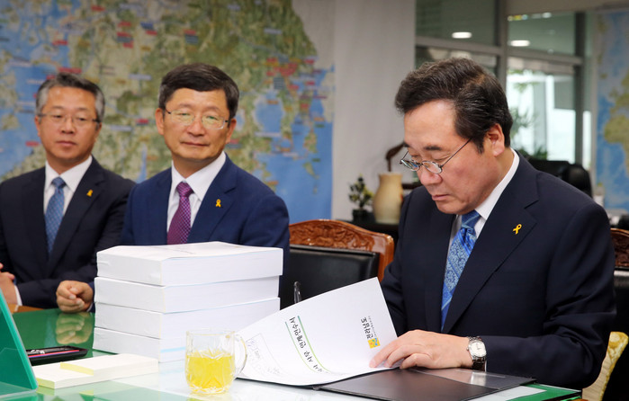 [세계로컬신문 김정태 기자] 이낙연 국무총리 후보자(전남지사)가 12일 오전 집무실에서 전라남도 지사 사무 인수인계서에 서명하고 있다.<사진제공=전남도청>