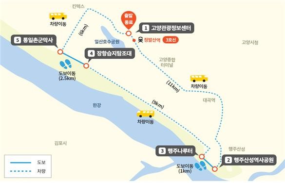 | ▲ 총 29.5km '고양'코스로 도보 3.5km, 차량 26km로 3시간 30분이 소요된다. (자료=행정안전부) |