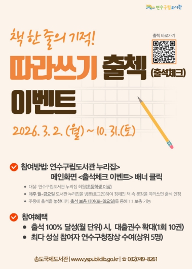 이번 행사는 초등학생 이상의 연수구립도서관 누리집 회원을 대상으로 진행되며, 도서관 누리집에 게시되는 ‘책 속 문장’을 그대로 따라 쓰는 방식으로 참여할 수 있다.