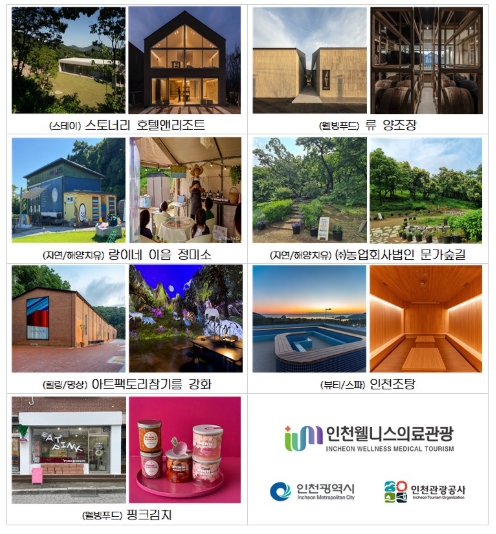 인천웰니스관광지는 6개 테마(자연·해양치유, 웰빙푸드, 힐링·명상, 스테이, 뷰티·스파, 헬스케어)로 나뉘며, 올해 신규로 선정된 관광지는 △스테이(강화 바다와 돌담 사이에서 특산물 차와 함께 사색을 즐기는 ‘스토너리 호텔앤리조트’), △웰빙푸드(마니산 천연 효모로 빚은 순수 증류주 페어링을 즐길 수 있는 ‘류 양조장’, 강화 지역 순무의 현대적 변신과 감각적 쿠킹 클래스가 가능한 ‘핑크김치’), △자연·해양치유(교동도 쌀과 실향민의 서사가 깃든 미식 소풍을 떠나는 ‘랑이네 이음 정미소’, 1만 2천 평 밤나무숲에서 즐기는 오감 치유 농업의 ‘문가숲길’), △힐링·명상(숲속 산책과 미디어아트가 함께 어우러져 힐링할 수 있는 ‘아트팩토리참기름 강화’), △뷰티·스파(백 년 역사 해수탕의 맥을 잇는 미네랄 스파를 즐길 수 있는 ‘인천조탕’)등 총 7개소이다.