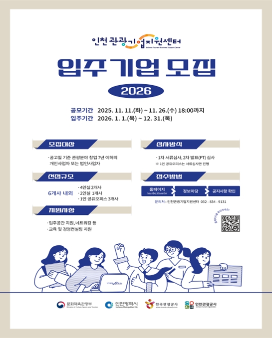 인천관광공사 김민혜 관광산업실장은“관광 창업기업이 안정적으로 성장하고 경쟁력을 높일 수 있도록 입주공간 및 지원 프로그램을 운영할 계획”이라며,“인천 관광산업의 미래를 이끌 창의적이고 유망한 기업들의 많은 참여를 기대한다”고 말했다.