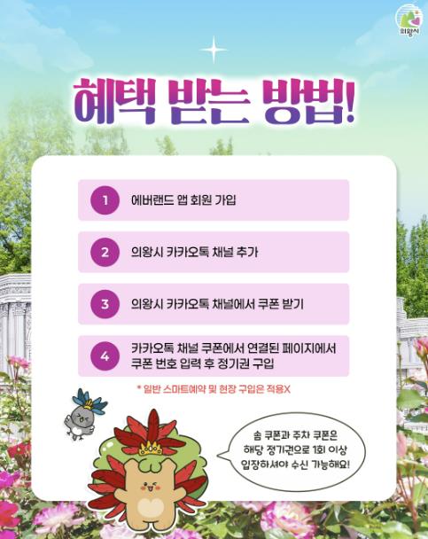 의왕시 카카오톡 채널을 친구 추가한 시민은 에버랜드 정기권(정상가 29만원) 구매 시 총 6만원 상당의 할인 혜택을 받을 수 있다. 혜택은 ▲2만원 즉시 할인 ▲에버랜드 내 현금처럼 사용 가능한 솜포인트 2만원 지급 ▲1만원 상당의 에버랜드 주차권 2매 제공으로 구성된다.