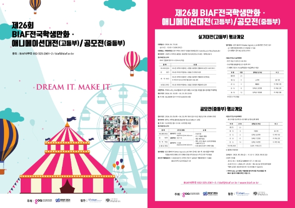 BIAF전국학생만화·애니메이션대전(고등부)은 전국 고등학교 재학생 및 졸업생, 동일 연령 청소년이라면 누구나 참가할 수 있다. 애니메이션, 만화, 캐릭터, 상황표현 등 총 4개 부문으로 진행되며, 3월 10일부터 3월 31일까지 엠굿 홈페이지를 통해 온라인 접수가 가능하다. 참가비는 36,000원이며, 부문별 주제는 3월 중 BIAF 공식 홈페이지와 엠굿 홈페이지를 통해 공지될 예정이다.