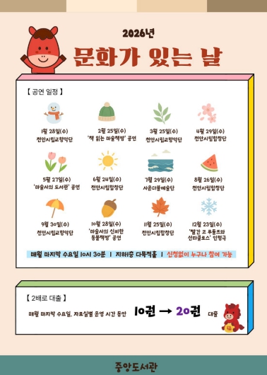 문화가 있는 날에는 1인 당 20권의 책을 빌릴 수 있는 ‘2배로 대출 서비스’와 다양한 공연을 만나볼 수 있다.