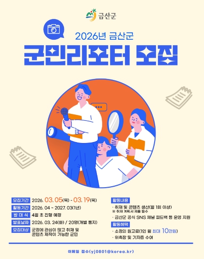 선발된 군민리포터는 올해 4월부터 내년 3월까지 1년간 금산군의 주요 축제·행사, 숨은 명소와 맛집 등 현장 소식을 취재해 콘텐츠를 제작하며 금산군 공식 소셜네트워크서비스(SNS)에 대한 운영 지원 및 피드백 활동도 하게 된다.