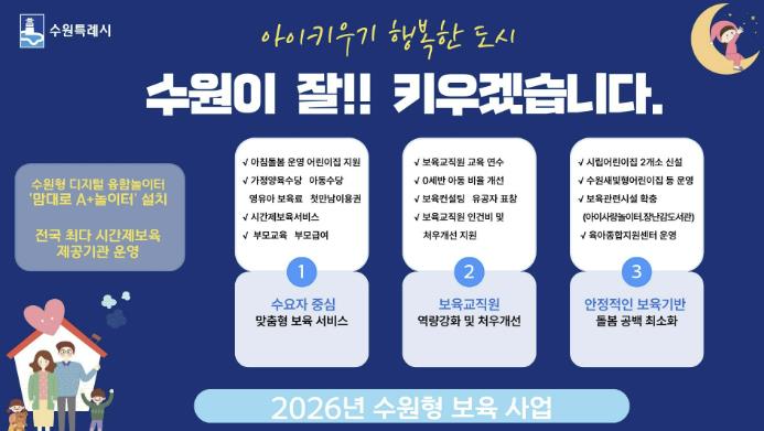 [세계로컬타임즈] ‘아이 키우기 행복한 도시’를 조성하고 있는 수원특례시(시장 이재준)가 ‘2026년 보육사업 시행계획’을 수립했다.