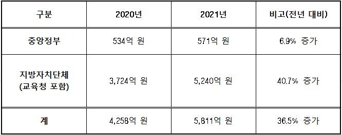 | ▲ 정부와 지방자치단체의 독서진흥 예산 (출처: 문화체육관광부, ‘2021 독서진흥에 관한 연차보고서’) |
