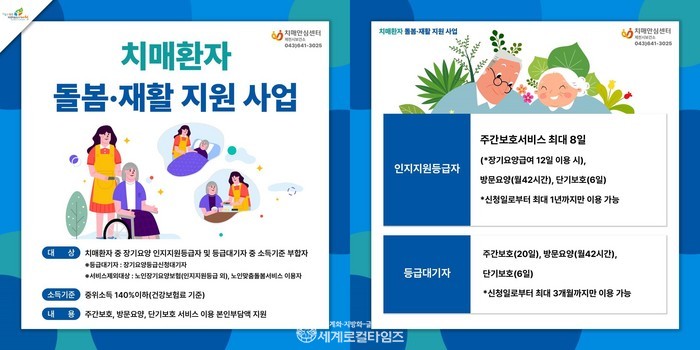 [세계로컬타임즈 김병호 기자]제천시에서는 치매환자의 보호기능 확대와 부양가족의 부담을 줄이고자 치매환자 돌봄 재활 지원 사업을 추진하고 있다.
